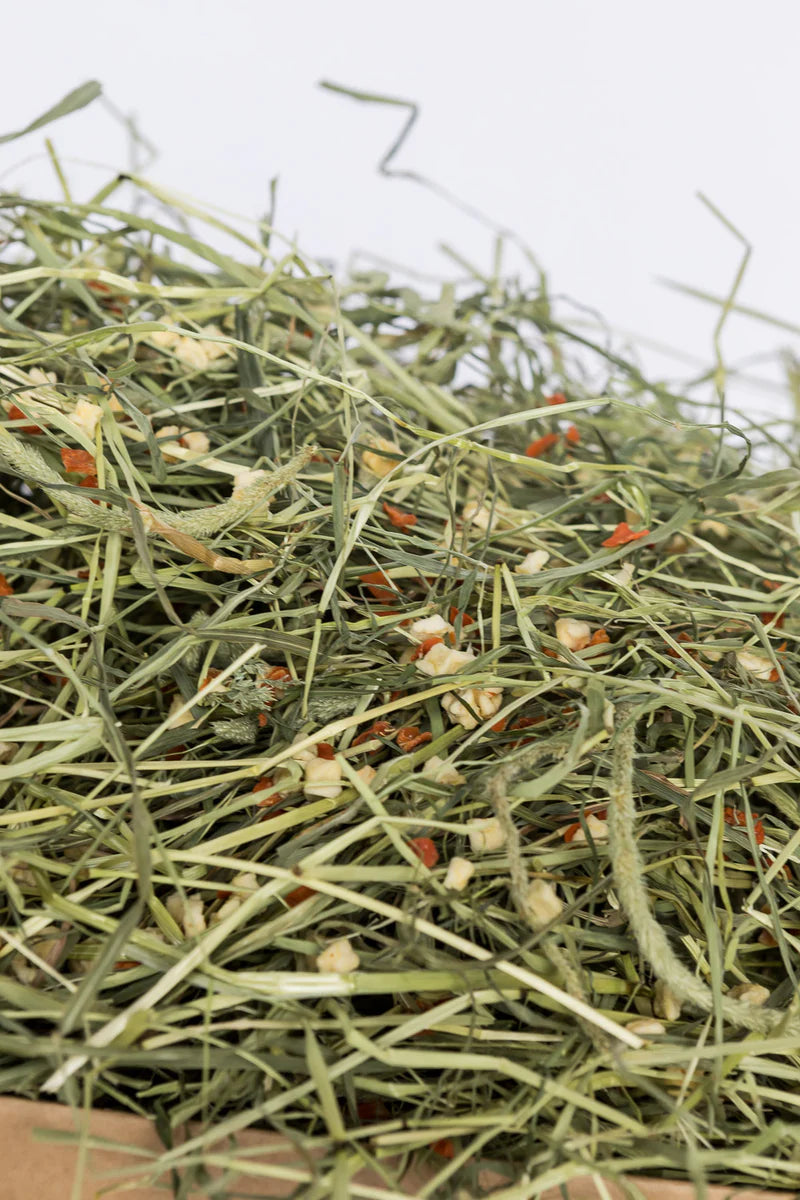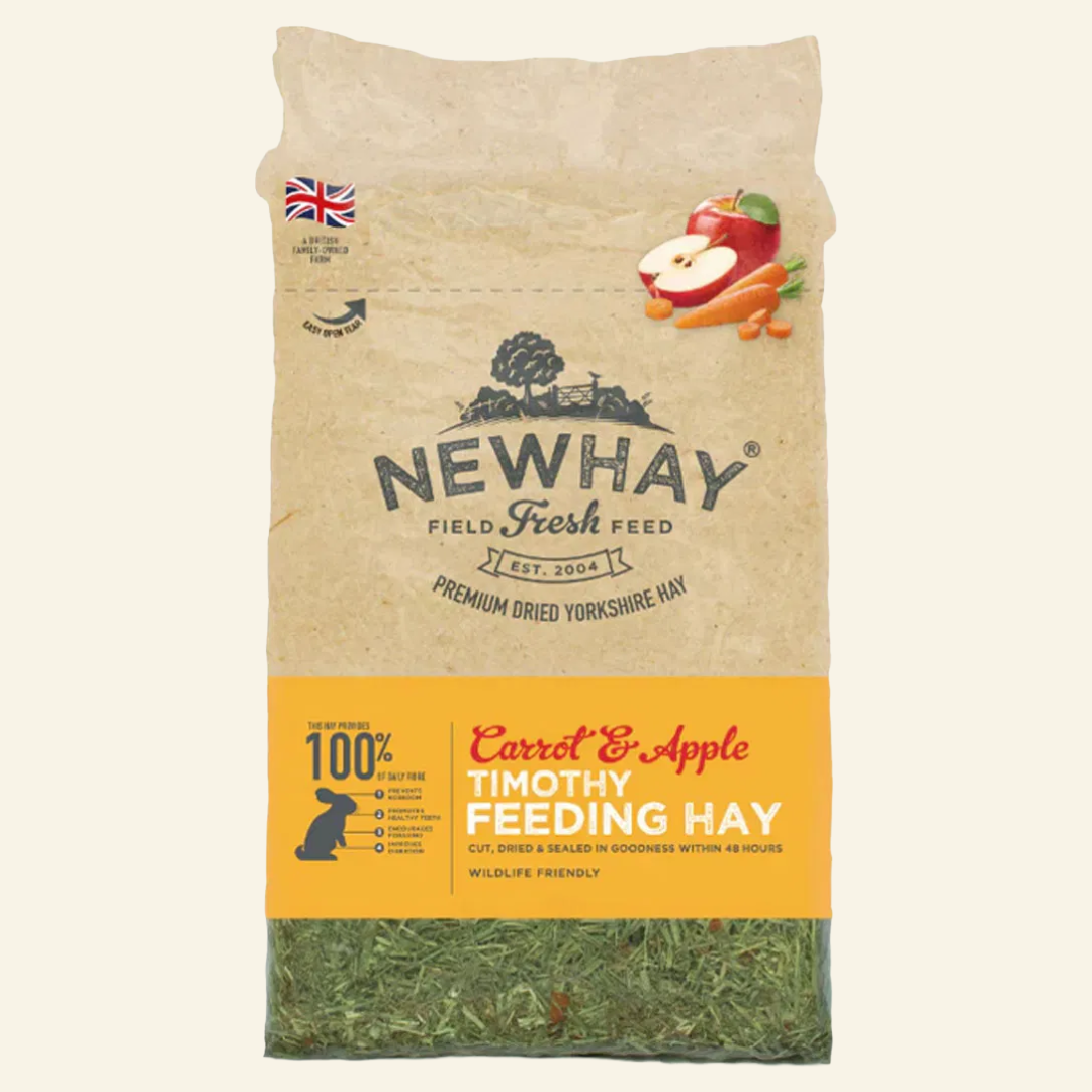 This Delicious Timothy Feeding Hay is grown in Yorkshire, and is harvested dried & packed within 48 hours to preserve maximum nutrition & taste. And with added carrot and apple to make it extra delicious!
